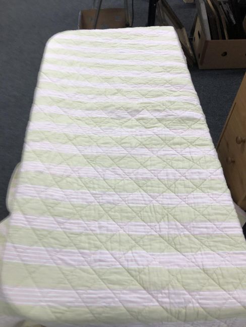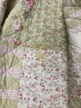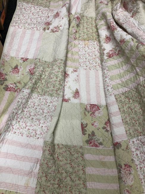 A box of Durham quilt, hand stitched quilt, two woolen blankets CONDITION REPORT: This quilt is roughly 250cm by 230cm. There are a couple of stains to the fabric, see close-ups, but fundamentally it appears to be in good order.