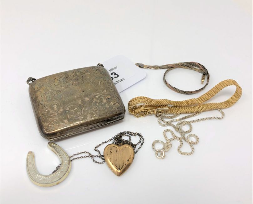 An engraved silver purse, a three-tone silver bracelet, silver necklace, locket etc