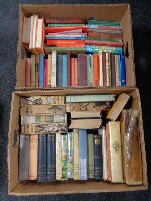 A box of twentieth century hardbacked books, novels, Robin hood, Iron pirate etc