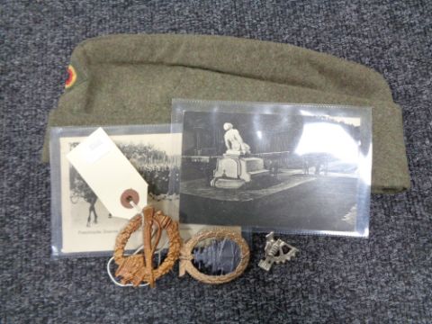 A twentieth century German cloth cap together with three military badges and three WWI postcards