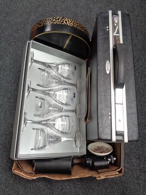 A box of Antler brief case, binoculars, set of six crystal glasses etc