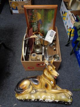 A twentieth century chalk dog - Alsatian, together with metal ware, framed miniatures etc