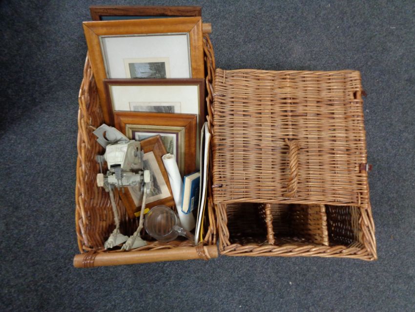 A wicker picnic basket and log basket containing framed prints, star wars walker, glass tankard etc
