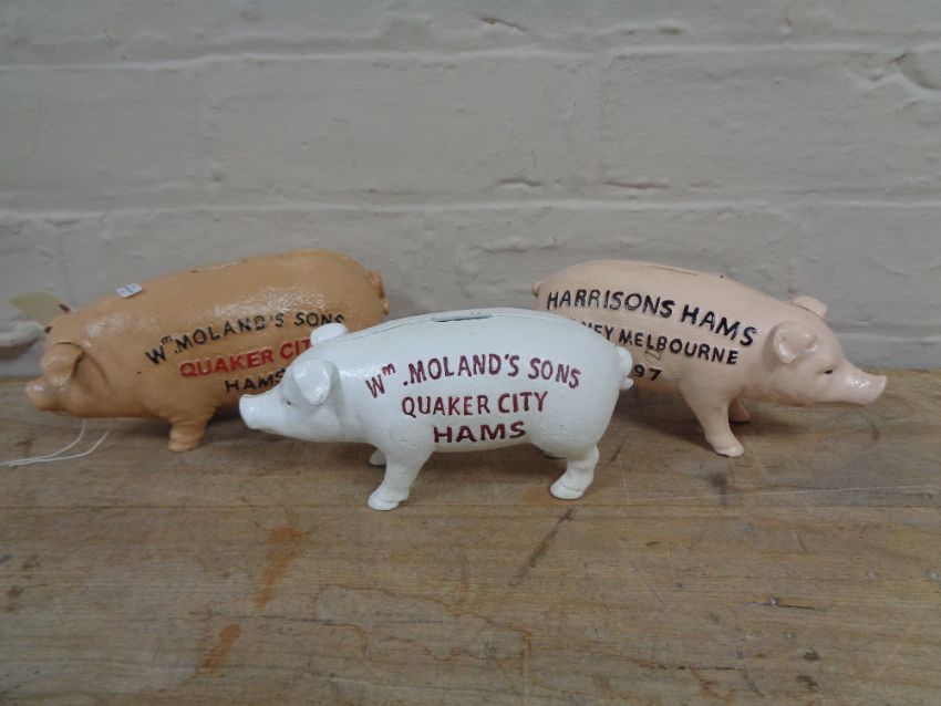 Three metal pig money boxes