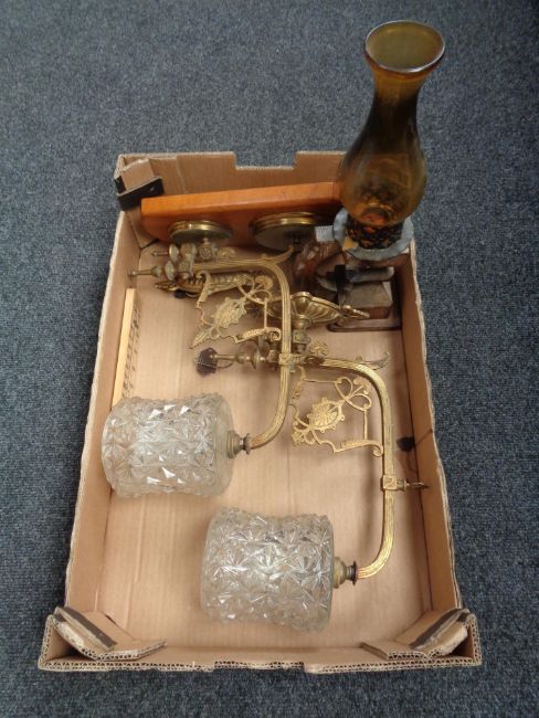A box of wooden candle holder with glass chimney, barometer on board, two antique brass gas lamps with shades
