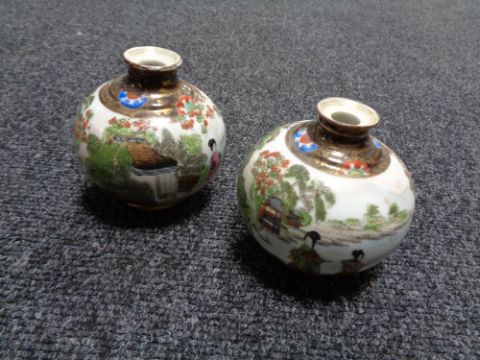 A pair of Noritake squat bulbous vases depicting Geisha, height 9 cm.