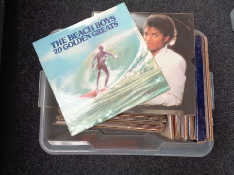 A box of vinyl lps including Stevie Wonder, Bee Gees, etc