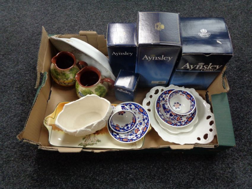 A box of china, Royal Doulton coaching scene sandwich plate, boxed Aynsley china, Limoges dish etc
