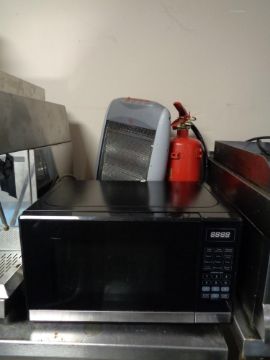 A microwave oven, halogen heater and a fire extinguisher