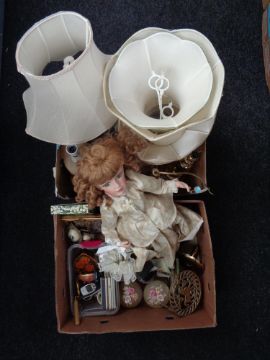 Two boxes of marble and brass table lamps, porcelain doll, trinket boxes, brass trivet etc