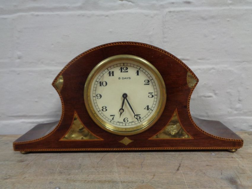 An early twentieth century inlaid mahogany Swiss made eight day mantel clock on brass feet