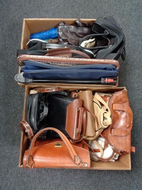 Two boxes of lady's leather hand bags, holdalls, cabin bag etc