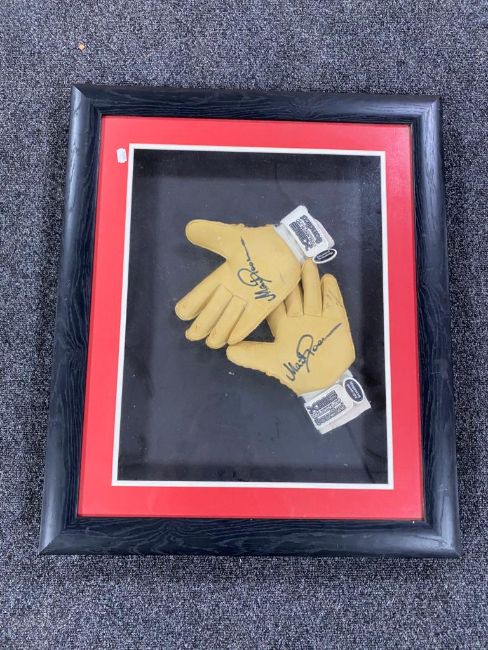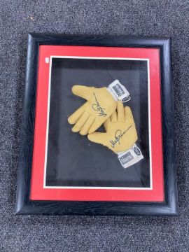 A framed pair of goalkeeper's gloves with signature