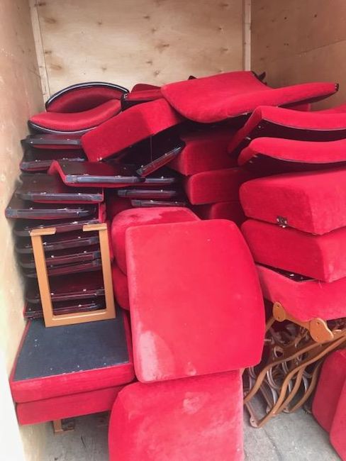 An entire cinema seating plan, early to mid 20th century - approximately 130-140 seats in total. This lot is disassembled and currently in storage in postcode NE12 Newcastle upon Tyne. The lot is not on view. The successful buyer must collect this from a storage facility in NE12 post sale.