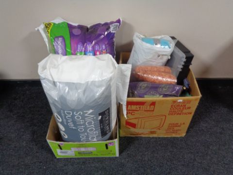 Two boxes containing wool, duvets, blanket, case of sewing threads