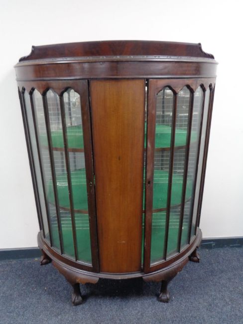 An early 20th century bow fronted display cabinet on claw and ball feet