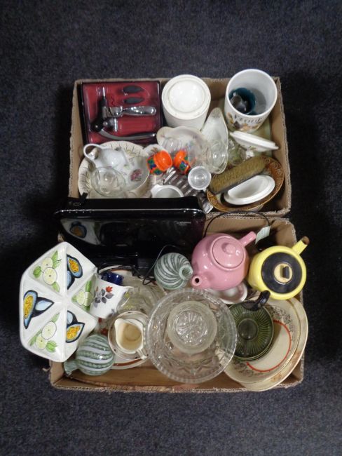 Two boxes of miscellany to include pair of hand blown bulbous vases, kitchen storage jars, teapots, glass ware, Humax free sat box