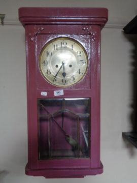 An early twentieth century painted wall clock with silvered dial, pendulum and key