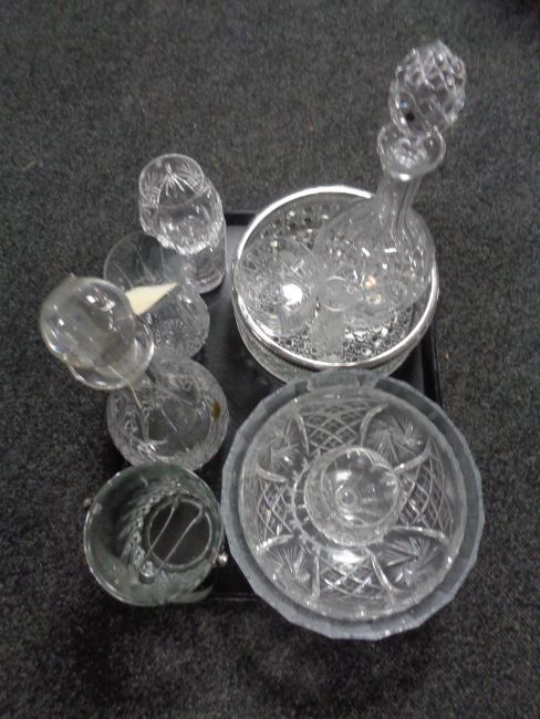 A tray of glass, water jug, fruit bowls etc