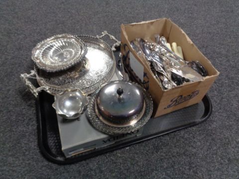 A tray of plated wares, cased and other cutlery, grape scissors etc