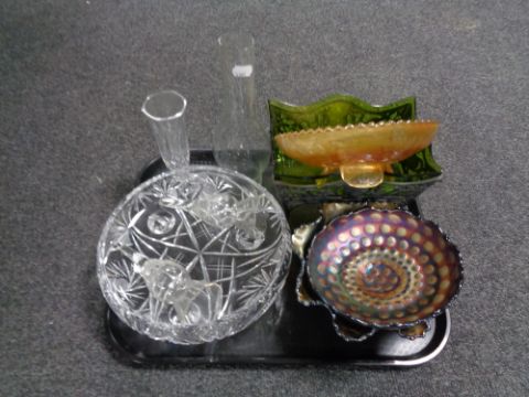 A tray of glass, carnival glass bowls, Art Deco trough with green glass liner, oil lamp chimney etc