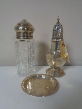 A Danish silver pin tray together with a cut glass silver topped sugar caster and one further sugar caster