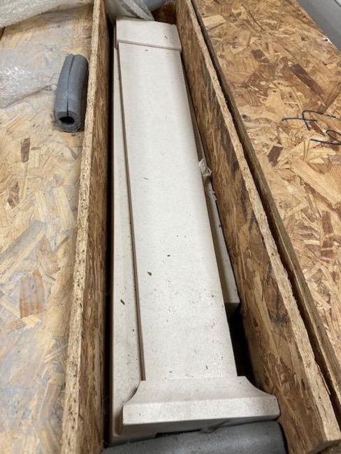 A lime stone fire place in wooden crate