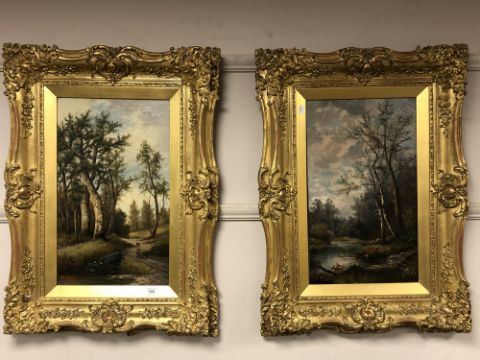 G. Haller, a figure in woodland, oil on canvas, signed, 30cm by 50cm, together with the companion piece (2)