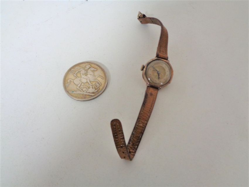 A Victorian 1890 silver Crown together with a 9ct gold lady's wristwatch on brown leather strap