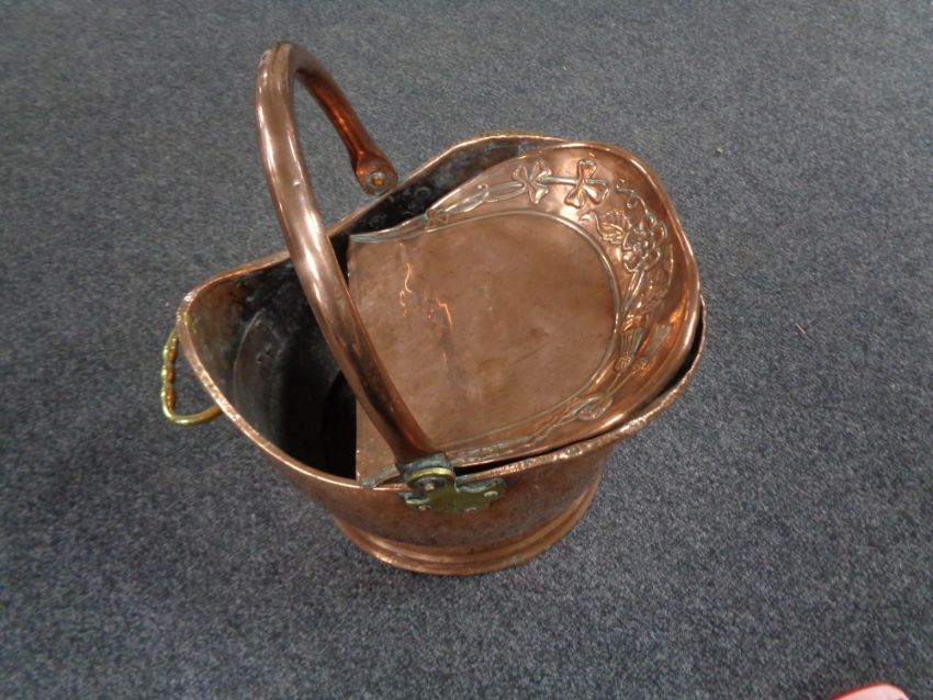 An antique copper coal bucket together with a copper embossed scoup
