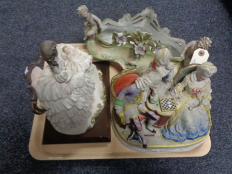 A tray of continental flower encrusted vase, pottery figure group of chess players, contemporary figure on base
