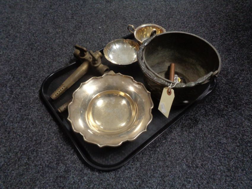 A tray of metal ware to include Chinese bronze swing handled embossed censer with dragon design, plated bowls, two vintage beer taps