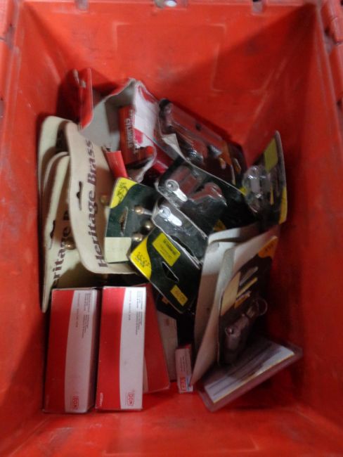 A box of Heritage brass door knockers, quantity of door locks with keys