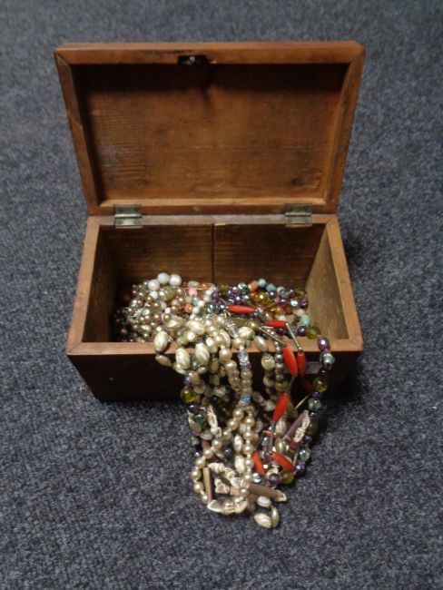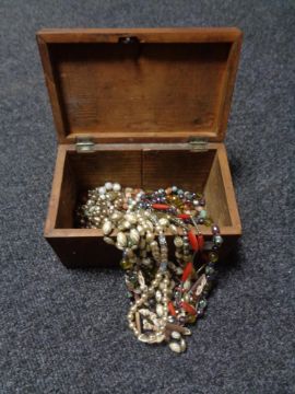 An antique inlaid wooden jewellery casket containing beads, necklaces, etc