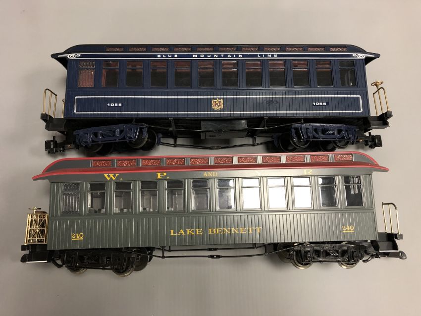 Two Bachmann passenger cars; Observation W.P. and R.Y. Lake Bennett and Blue Mountain Line. (2)