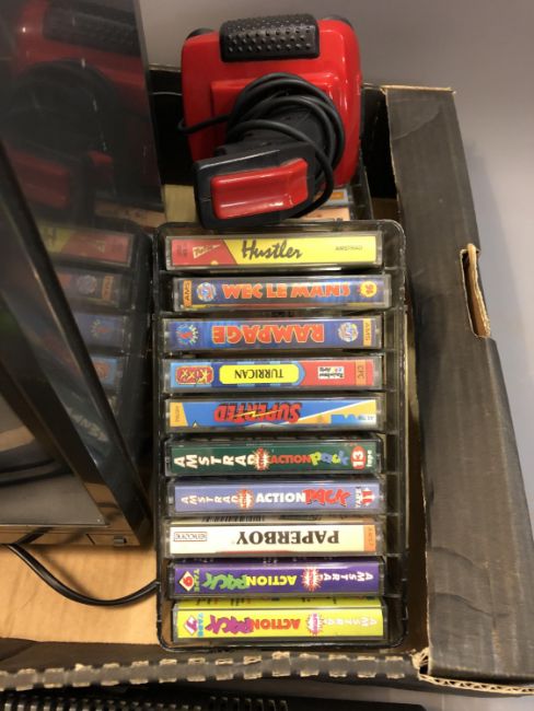 An Amstrad 64K Colour Personal Computer keyboard and monitor, Amstrad magazines, Beau-Jolly Big Box Mega Games Amstrad cassettes etc.