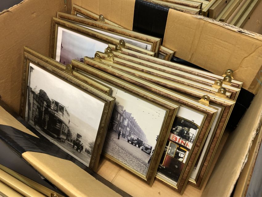 A large quantity of framed photographic prints depicting Binns trams, approximately 43. (Two boxes)