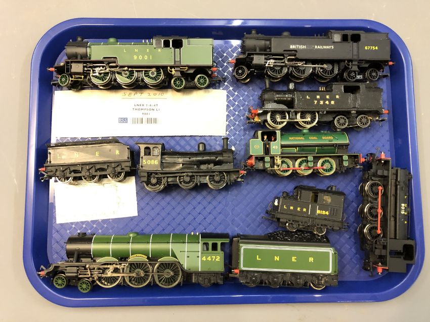Hornby - LNER 2-6-4T Thompson LI 9001 locomotive, together with six other Hornby locomotives/carriages, another unmarked metal LNER 7348 locomotive, unmarked plastic LNER coal carriage and a Tenshodo LNER 8154 locomotive, ten unboxed models, as illustrated. (10)
