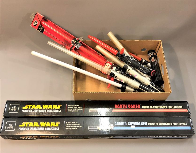 Two Star Wars Force FX Lightsaber collectable's, in original packaging, together with several other Star Wars lightsabers.