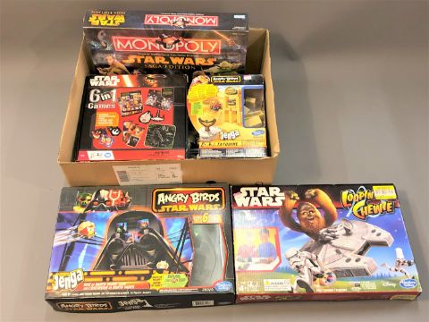 A collection of Star Wars games including Star Wars Saga Edition Monopoly, in original retail packaging, Star Wars Saga Edition chess set, interaction video board game, Jar Jar Binks 3D adventure game, Star Wars Angry Birds etc. (two boxes)