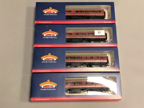 Bachmann - 34-251D 57ft Corridor Composite LMS Crimson, 34-226D 57ft Corridor Brake Third LMS Crimson (X2) and 34-252D 57ft Corridor Composite LMS Crimson, four boxed models. (4)