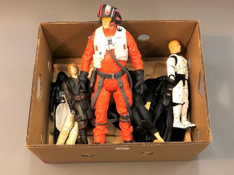 A collection of unboxed Star Wars figures : Storm Troopers, heroes and villains, two Jar Jar Binks figures in case, monster figures etc (two boxes)
