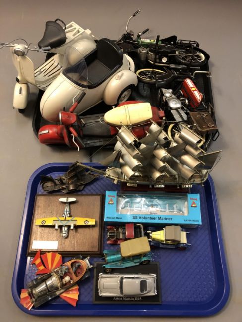A collection of die cast cars and motorbikes Corgi Chitty Chitty Bang Bang, model ship 'Marco Polo' etc. (Two trays)