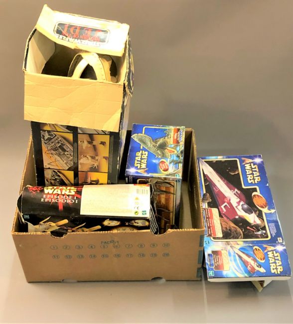 Four Star Wars models with original boxes : Return of The Jedi rebel transport, Obi-Wan Kenobi's Jedi Star Fighter, Episode I Anakin Skywalker's pod racer and Attack of The Clones Acklay Arena Battle Beast, together with two Clone Trooper helmets. (two boxes)