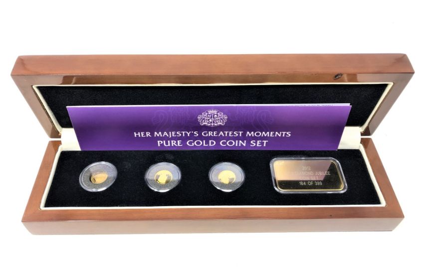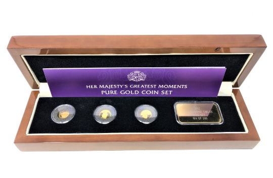 The London Mint Office - Her Majesty's Greatest Moments, pure gold coin set to include The Birth of a Princess, The Coronation and The Diamond Jubilee, each 24ct gold (3.6g).
