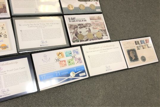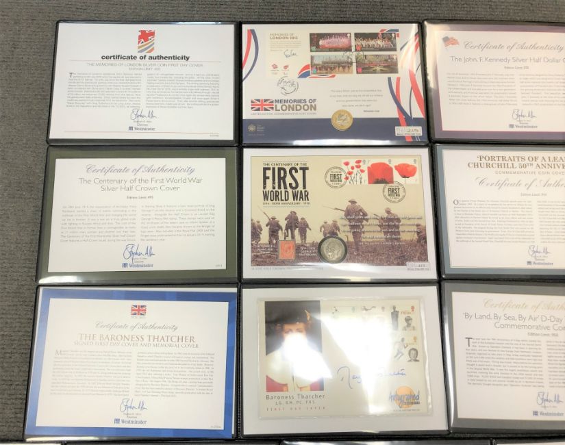 A collection of nine commemorative coin or First Day covers to include - Westminster First World War, Sir Winston Churchill, JFK Silver half Dollar, Memories of London 2012, Baroness Thatcher (signed), D-day by Land, By Sea, By Air, Glasgow games silver proof coin, End of The Stuarts silver coin and Penny Black silver coin cover. (9)