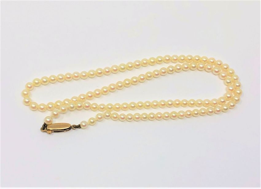 A 16 inch strand of pearls on a yellow gold clasp