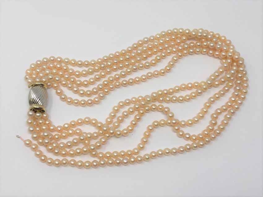 A good quality 15 inch five strand pearl necklace on two tone 14ct gold catch