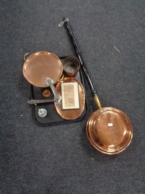 A copper bed warming pan together with a tray of lidded pan and pot, Cloisonne hand bell, treen bottle stopper