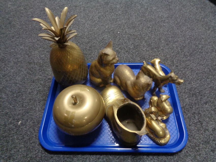 A tray of assorted brass ware, animal figures, boot planter, fruit storage jars